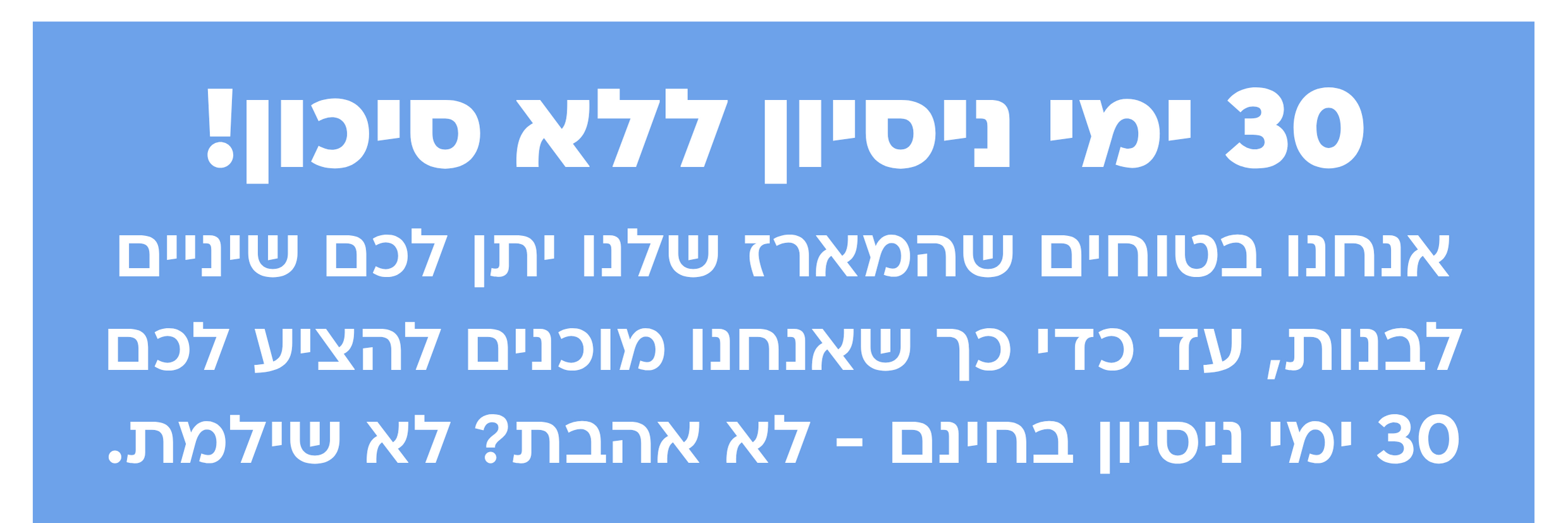 בדיוק בשביל זה אנחנו מציעים 30 ימי ניסיון בחינם! לא מרוצים מהתוצאה לאחר 30 ימים? פנו אלינו וקבלו החזר כספי!